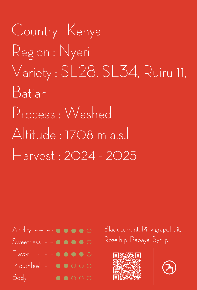 AA カロゴト / ケニア Flavor Profile: Black currant, Pink grapefruit, Rosehip, Papaya, Syrup.ブラックカラントやピンクグレープフルーツの果実感、ローズヒップやパパイヤの風味とシロップのような甘さと質感。 生産国 Kenya ( ケニア ) 精製所 Karogoto Factory ( カロゴト・ファクトリー) 生産者組合 New Tekangu Farmers’ Cooperative Society (ニューテカング生産者組合) 産地 Nyeri ( 二エリ ) 品種 SL28, SL34, Batian, Ruiru...